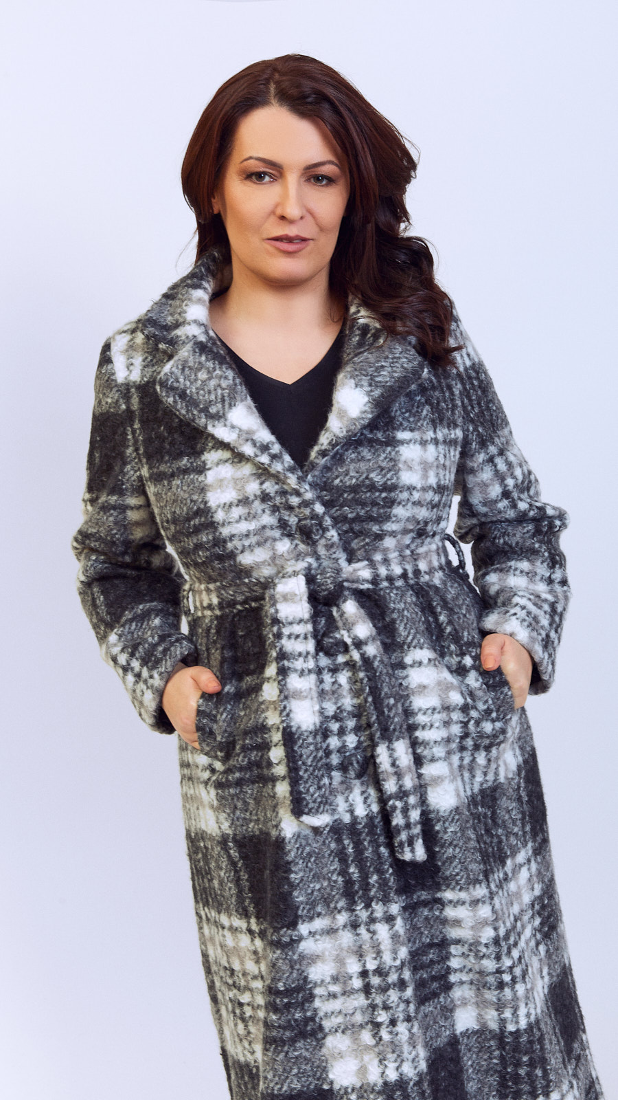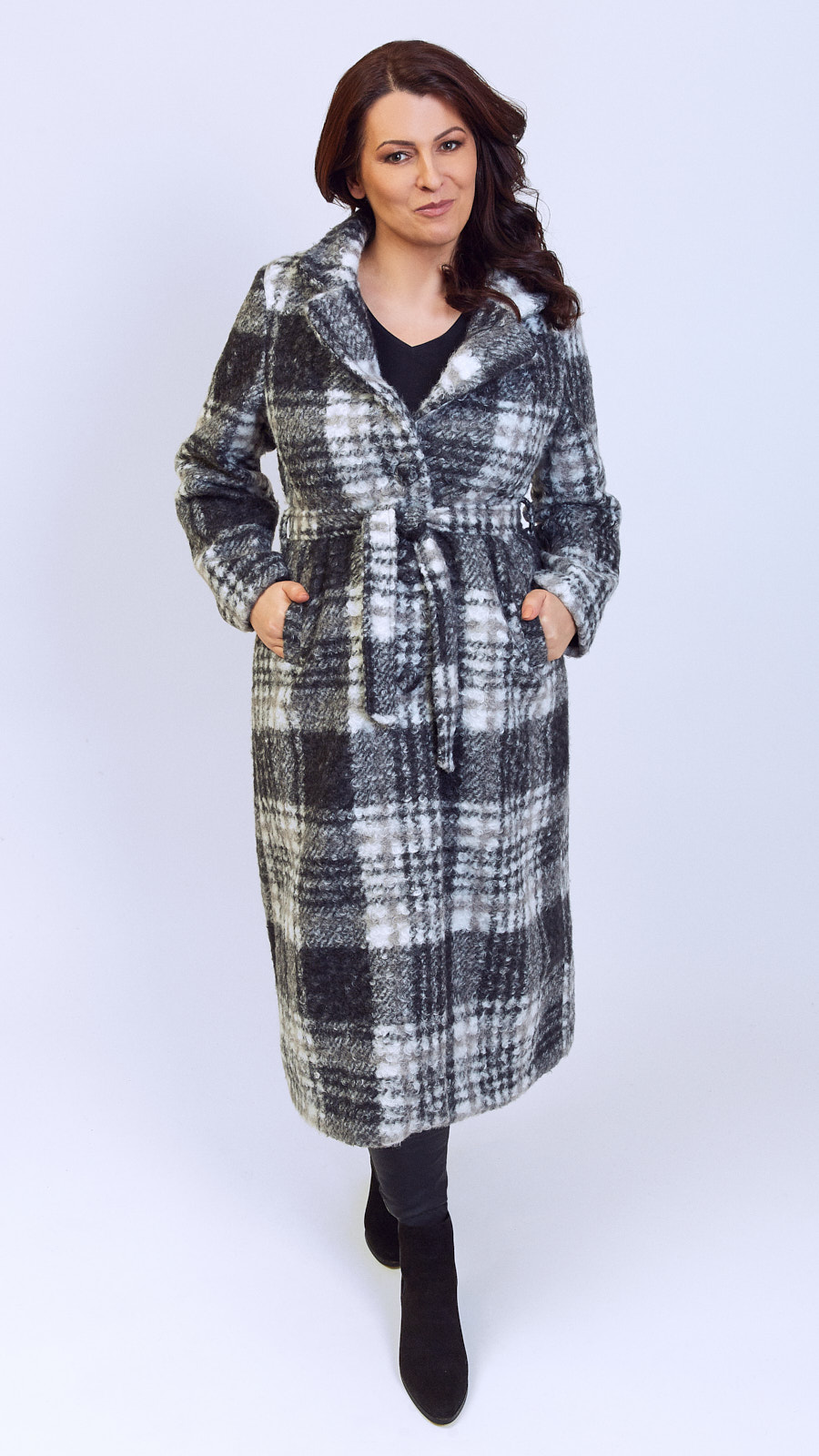 - Stilvoller Mantel mit modischem Karomuster und vollem Futter, geknöpft, mit zwei Taschen und einem Gürtel