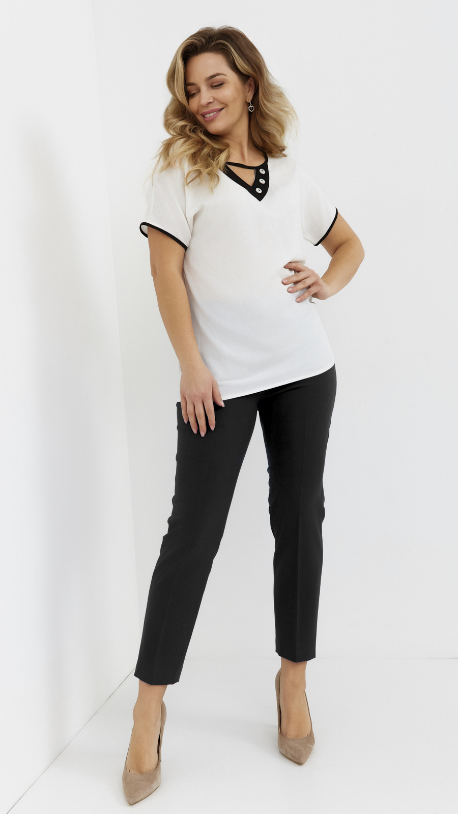 - Women's tunic with a unique neckline decorated with buttons. Perfect for the spring and summer period with short sleeves.