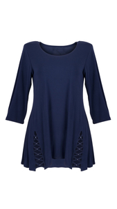 Granatowa elegancka tunika damska zdobiona unikalnym warkoczem z lamówek