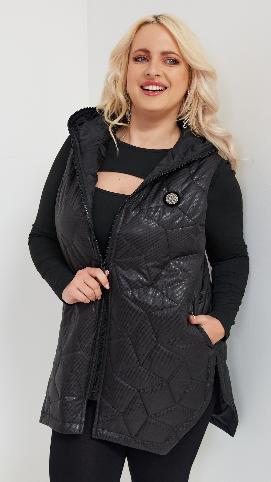 - Długa kamizelka, delikatnie ocieplana pikowana w geometryczne kształty z materiału wodoodpornego. Nie krępuje ruchów, posiada wydłużany tył. Zapinana na zamek błyskawiczny z praktycznym kapturem i kieszeniami.