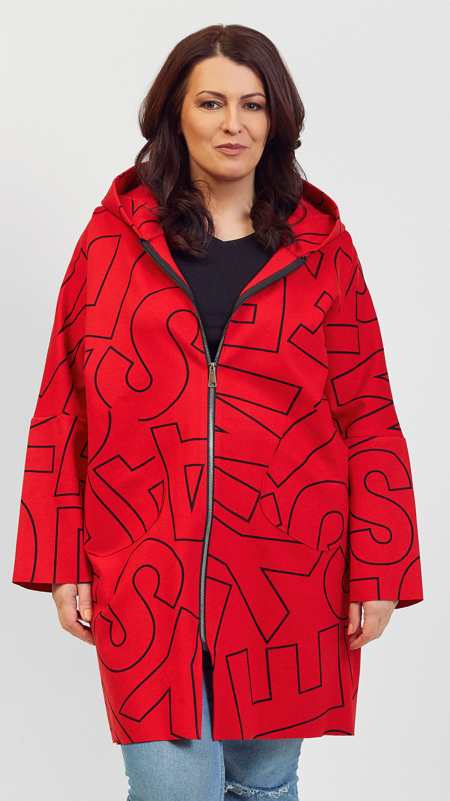 Czerwony płaszcz damski z kapturem wiosenny jesienny krótki z nadrukiem