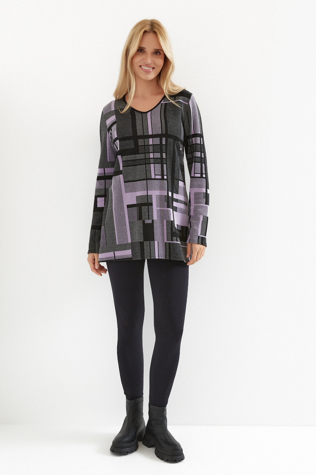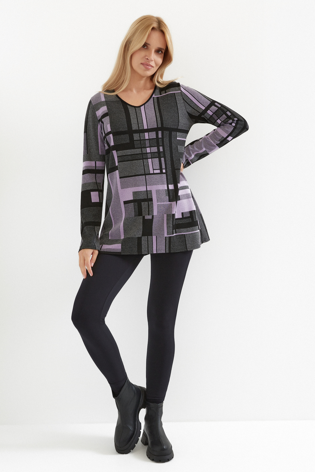 Szara ciepła tunika damska jesienna z liliowymi motywami